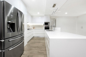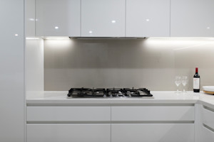 To match the stainless-steel SMEG undermount, double bowl sink the appliances chosen include a 900mm St George gas cooktop, AEG wall oven, 900mm Sirus slide-out rangehood (externally flued), and a 600mm AEG dishwasher. The walk-in butler’s pantry is cleverly concealed by an integrated cupboard door.