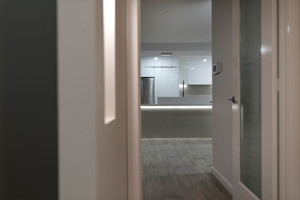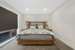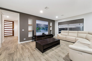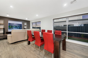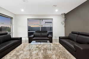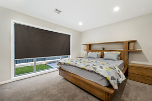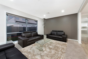 In the bedrooms, the walk-in-robe features hanging space and shelving in white melamine with auto LED lights with the built-in robes featuring glass sliding doors. All bedrooms are carpeted for maximum comfort while the master bedroom features dimmable LED downlights, a TV wall recess with hidden AV cords, a data point plus provision for connecting Foxtel.