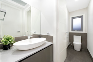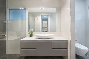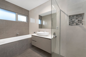 Family and visitors alike will enjoy the amenities of the main bathroom which include floor-to-ceiling tiles, a Hansgrohe PuraVida basin mixer and bath/shower mixer, Kaldewei Eurowa bath, Phoenix water sheet bath outlet, semi-frameless shower with aluminium frame, Rogerseller square Cloud shower rose in chrome, Apaiser Sanctum basin in Moonbeam, Rogerseller Verso basin, heated towel rail, Vivo back-to-wall dual flush toilet with soft-close seat and frameless polished-egde mirrors. The vanity features a 20mm Caesarstone benchtop while the shower sparkles with a feature mosaic tile in the niche.