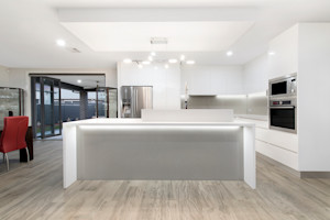 The central feature of the home is the large, open-plan kitchen/living and family zone which is located in the middle of the house adjacent to the alfresco entertaining area for maximum functionality. The kitchen is fitted out with a 40mm quartz benchtop to complement the Thermoform vinyl wrap cabinets and panels and the owners love the inclusion of soft-close drawers, glass splashback and chrome sink mixer.