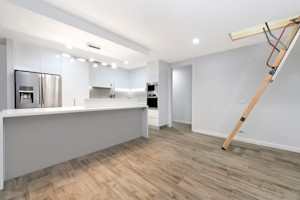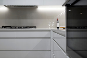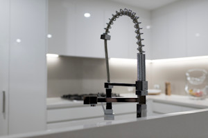The laundry’s custom cabinetry is complemented with a Neko Cruze 45-litre flushline laundry tub plus a Phoenix sink mixer with pull-out spray. The splashback is tiled while the benchtop is a 20mm Caesarstone. Cabinetry includes a magnetic lock system for extra safety.
