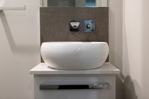 The ensuite bathroom is kitted out to match but with a wall-mounted white single drawer cabinet and Rogerseller Catalano Zero 50 wall-hung toilet with soft-close seat.