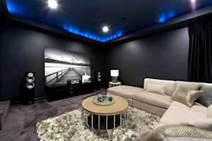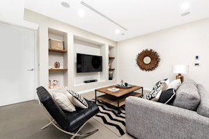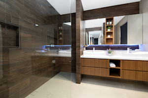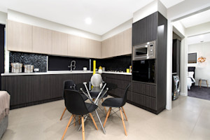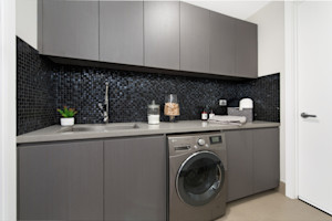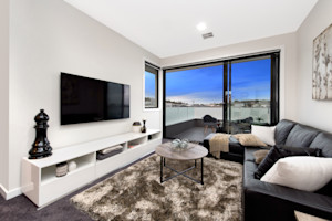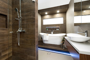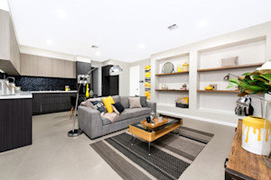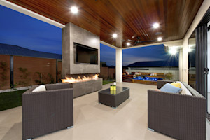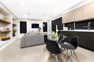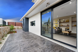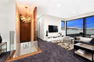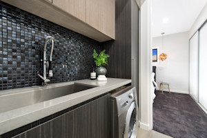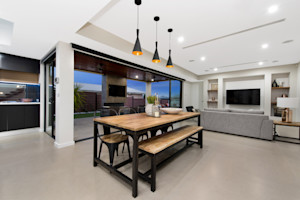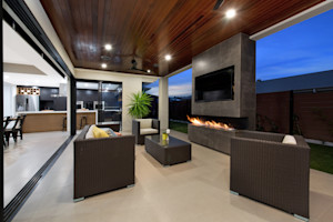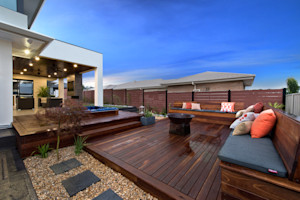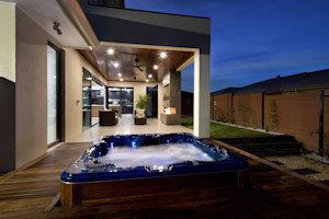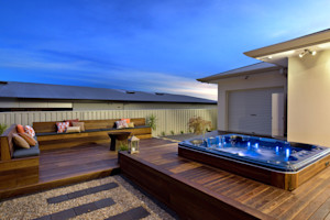 A six-piece stacker door retracts to open the living area to the alfresco space and create one, large indoor/outdoor entertaining space. The alfresco area is specially designed to allow the homeowners to relax and enjoy their home with a six-person spa recessed into the spotted gum deck.