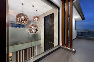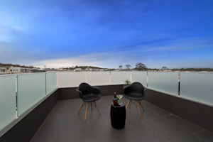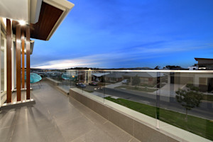 Externally, the home features front and rear balconies, with fully-frameless glass balustrades, from which the owners can enjoy the extensive, elevated views of the Mountains in the distance and the adjacent nature reserve.