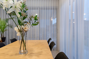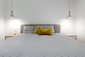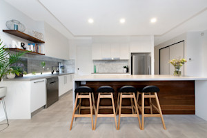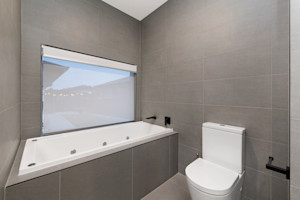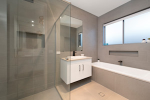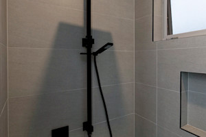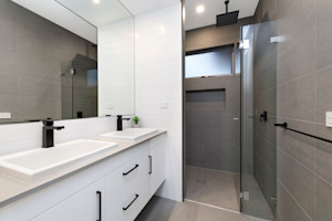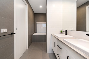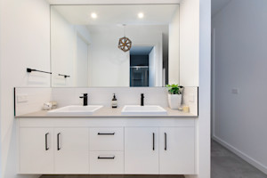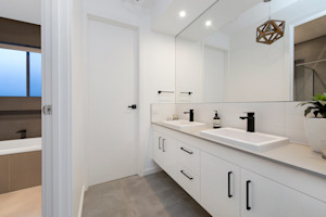 The master bathroom and main bathroom are large enough to include blissful bathing with a Caroma Shark bath and a Kaldewei Eurowa bath – both rectangular in shape. In keeping with the monochromatic colour scheme, the cabinetry is a crisp white while the tapware and accessories in both bathrooms are a gorgeous black. To keep the bathrooms bright and airy a semi-frameless, clear glass shower screen with an aluminium frame and pivot door was specified for each. Floor-to-ceiling full-height tiles complete the luxury finish.