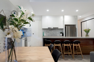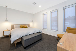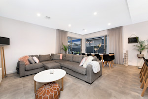 The open-plan living area at the rear of the house includes the kitchen, dining room, family room and access to the back garden. The kitchen is a particular highlight with its 40mm Caesarstone benchtop with feature waterfall end and walk-in pantry with plenty of storage and its own sink area. The kitchen has been fitted with a 99mm Bosch induction cooktop, 900mm Ariston multifunction oven, 900mm Ariston slide-out rangehood and 60cm Ariston dishwasher to ensure meal prep and cooking is easy whether catering for a crowd or making a simple dinner for two.