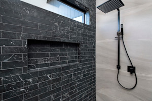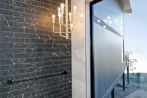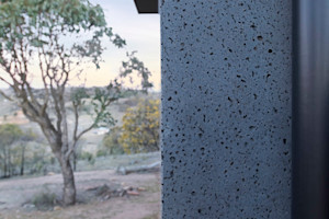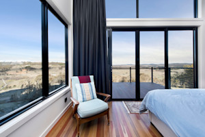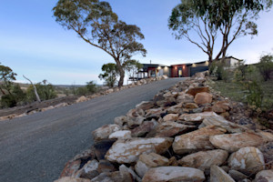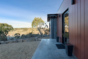 Externally the building is clad in textured Tasmanian Oak cladding – a sustainable composite timber product which is the perfect choice for this rugged setting. Two feature walls break up the expanse of timber and add a visual point of difference. Colorbond Stramit Corrugated Cladding in Monument is ideal to off-set the warmth of the timber while the rough texture of the Stone that was removed from the earthworks and relocated around the home as a lovely complement to the surroundings.