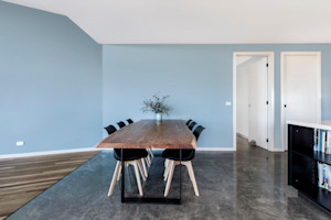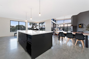 The interior is just as impressive with a well-considered open-plan layout which is cleverly divided into different zones or rooms thanks to flooring in polished concrete and timber and varying ceiling heights. This has created an interior that is equally warm and welcoming as it is open, light and bright.